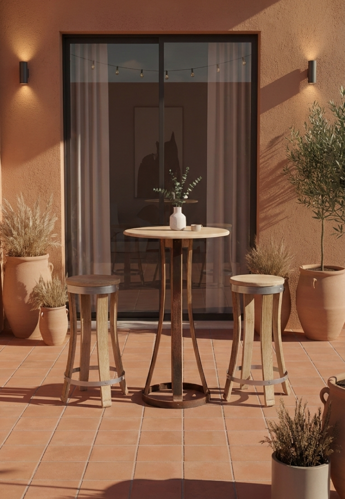 Pour une atmosphère plus artisanale, la collection Vic’Art s’impose avec évidence. D’inspiration bistrot, ces pièces sont façonnées à partir de fûts d’occasion de vin ou de cognac. Marqué par le temps, l’alcool et la flamme des tonneliers, le bois révèle une patine singulière, chaleureuse et authentique. Entièrement réalisés à la main, ces meubles aux accents rustiques apportent du caractère et une présence authentique à chaque espace.